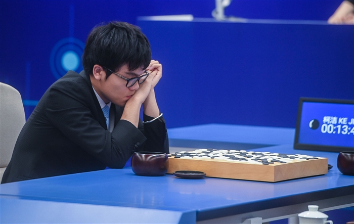 5月23日,中国棋手柯洁在比赛最后时刻。当日,中国棋手柯洁九段和围棋人工智能程序“阿尔法狗”(AlphaGo,直译阿尔法围棋)的首场对决在浙江省桐乡市乌镇举行,“阿尔法狗”执白以四分之一目战胜柯洁。本次对决于5月23日至27日在浙江乌镇展开三番棋对决。