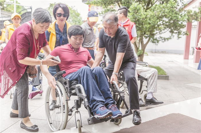见习记者 景小芳 本报讯 为进一步弘扬中华民族扶弱助残的传统美德,助力形成全社会理解、关爱、帮助残疾人的社会氛围,昨天上午,区残联牵手本报报春花志愿者服务队,组织开展了“一家人·圆心愿”让重度肢体残疾人游溪口活动。 本次活动受到社会各界的关注,爱心人士用不同形式来表达他们的爱心。丹盈服饰总经理吴珏出资出租车的来回费用,胡锡浓为参加活动的残疾人及家属免费投保,奉溪出租车公司爱心的哥纷纷加入爱心车队,12名本报报春花志愿者和11名“无名公益”志愿者对残疾人进行全程陪同。2名医护人员也加入爱心志愿者队伍,为残疾人出游溪口提供安全保障。 当天上午8时,14名来自莼湖、大堰等地的重度残疾人和部分家属乘坐爱心车队从家中抵达区残联,“无名公益”志愿者贴心地送上了毛巾、水杯等伴手礼。大家随后共同乘坐爱心车队抵达溪口的武岭门。在上下车环节,记者发现,尽管身患重度残疾,但参加活动的每位残疾人朋友都十分坚强,一度坚持自己上下车。随后,在欢声笑语中,大家共同在武岭门下合影。 活动还邀请了一名爱心导游为大家全程讲解景点。沿着风光秀丽的剡溪,志愿者一边帮助推着轮椅,一边与残友聊天谈心,前往蒋氏故居和溪口博物馆参观,了解家乡溪口的历史文化。由于景点免费开放了无障碍通道,原本程序繁琐的参观过程变得格外顺利。“小心这个石阶,你们先走,我们没关系。”一路上,周围的游客朋友主动为这个特殊的旅行团让路,帮助他们顺利通行。上午10时,活动结束后,大家依依惜别,乘坐爱心车队返回自己家。 “非常开心能来溪口参观,十分感谢社会各界对我们残疾人的关心和照顾。”家住锦屏街道的林先生在接受记者采访时表示。来自莼湖的残友沈先生回忆6年前来溪口的情景说:“今天的溪口变化很大,这边的房子建得越来越美,旅游业发展带来的游客也多起来了。我为家乡的建设发展而自豪。” “一周前听说有这个活动就报名参加,我想尽自己之力帮助他们,我们志愿者只想实实在在为社会做些贡献。”一位“无名公益”志愿者说。 区残联副理事长康安生表示,区残联希望通过此次活动勉励残疾人朋友自立自强,激发社会助残热情,助推我区残疾人事业更快更好发展。 图为志愿者帮助残疾人进入溪口博物馆。