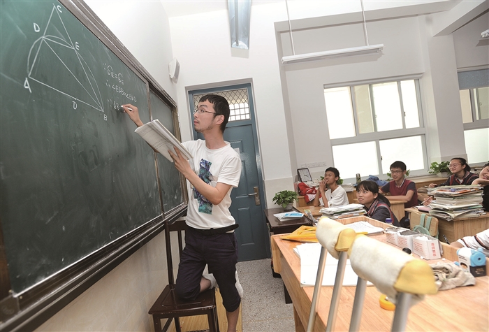 记者 斯玲娅 通讯员 乌雯雯 暮色下,他抬着打着石膏的右脚,拄着双拐,靠着左脚,缓缓地走向初三5班的教室,为留校学生作课后辅导。他就是近日引得朋友圈热议的“最美背影”主人公——溪口中学数学教师兼初三5班班主任巩冠男。 毫无察觉被偷拍 6月8日下午5时40分多,溪口中学语文教师邬红磊从食堂回办公室改试卷,走到三楼时,她看到了拄着拐杖、缓步前进的巩冠男。此时夕阳正西下,柔和的暮光洒在楼道上,整个校园被镀上一层金光。“当时看到觉得他特别不容易,随手拍了下来。”邬红磊随后将照片发到了微信朋友圈,短短10分钟,便得到了30多个赞和10条评论。网友“嘟嘟”说:老师们真把自己当铁人。一些看到此景的网友转发了这张照片,再次收获一片点赞。 记者联系到巩冠男时,他连连道:“没做什么没做什么。”对于自己突然成了朋友圈的“校园网红”,向来内敛的他显得有些害羞,认为自己做的事稀松平常。校长吴湖海则表示,巩冠男没有请假,对于他受伤一事,自己是上周二日常巡课中发现的。这时,离他受伤已经过去了3天。 临近中考意外摔伤 6月3日晚上,巩冠男回家走楼道时,不小心右脚踩空摔落至楼梯平台,当时就剧痛难忍。医生诊断为脚踝骨裂,并告知他“受伤的右脚三周内不能下地。”家人也劝他在家休息一周。但眼看中考临近,巩冠男心里放不下学生。6月5日一早,他搭上同事从城区至溪口的顺风车,左脚跳完三层楼的台阶,准时出现在初三5班的教室。 “巩老师,你怎么受伤了?”“巩老师,我来扶你吧。”巩冠男以这种特别的姿态出现时,引发了学生的集体关心。当天上午,巩冠男“金鸡独立”,给学生上课。站久了坚持不住时,则坐在教室的东北角为学生讲解题目。高亢洪亮、铿锵有力的声音清晰地传至教室的每个角落。班长陈宝发告诉记者,看老师走路、站立那么吃力,大家特别心疼他,希望他可以回家休息。 前几天教室后门的门锁坏了,趁着午休,巩冠男将双拐放一旁,猫着腰、踮着脚尖修好了门锁。学生们自告奋勇轮流为他从食堂打包饭菜,用餐完毕后,再将菜盘送回食堂。 登三层楼梯、一天四节课、来回办公室与教室,刚打上石膏的右脚显然无法适应。“最大的感受是脚腿麻了,不过这都是正常反应,能克服。”巩冠男告诉记者,孩子们快要中考了,他要陪着他们走完最后这个阶段。 坚守自己的初心 巩冠男是锦屏街道人,1989年出生,毕业于广州大学数学与应用数学专业,2013年至溪口中学任教。 这些即将步入中考的学生,巩冠男陪他们走过了3年。初一到初三,孩子们在每个阶段都有不同的特点,巩冠男更喜欢以平等沟通的方式与孩子交流。学生汪洋彬告诉记者,巩老师上课幽默风趣,交流起来平易近人,虽然对他们比较严格,但是同学们很喜欢他。 “我读大学时就想要当一名老师。”巩冠男说,受伤只是小事,妻子的支持让他能安心工作。“希望学生们能够取得理想成绩,对得起自己三年的光阴。” 图为巩老师正在上数学课。 记者 王红雨 摄