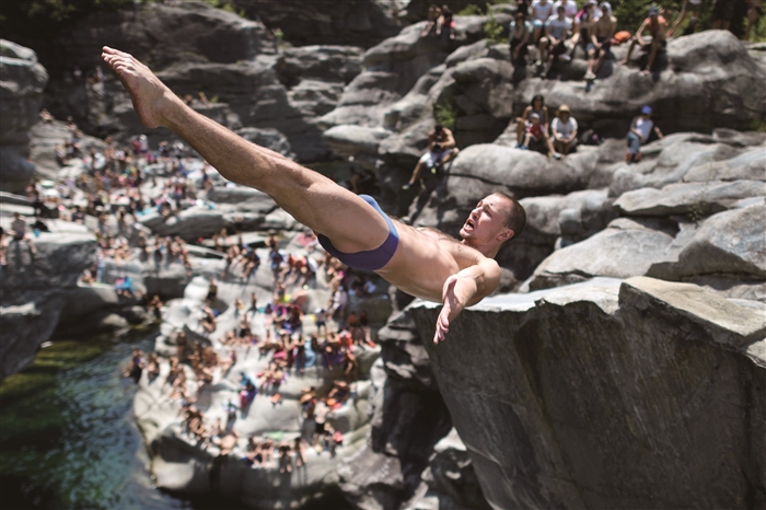 7月22日,在瑞士蓬泰布罗拉的海边,乌克兰跳水选手瓦季姆·内第尔科参加悬崖跳水比赛。