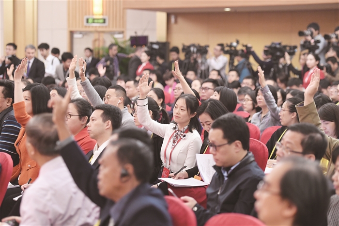 10月20日,中国共产党第十九次全国代表大会新闻中心举行记者招待会,请中宣部副部长孙志军、中央文明办专职副主任夏伟东、文化部副部长项兆伦、新闻出版广电总局副局长张宏森介绍加强思想道德和文化建设情况,并回答记者提问。这是记者在举手提问。 新华社发