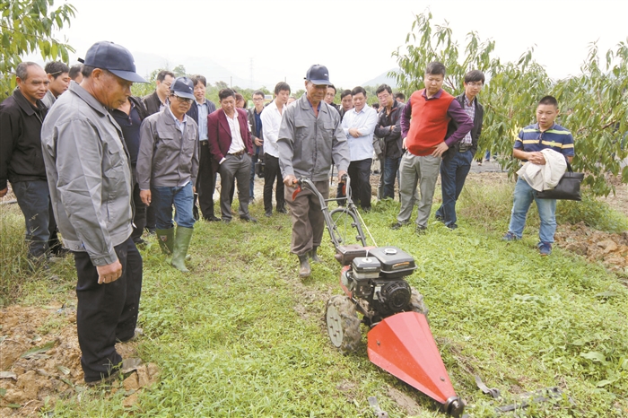 记者 徐华良 通讯员 王维维 本报讯 昨天上午,来自全区120多名水蜜桃种植大户和农技人员齐聚宁波德馨园生态农业科技有限公司的水蜜桃基地,参加由区农林局举办的水蜜桃栽培新型农机现场会,聆听专家讲解技术,观看各种新型农机操作演示。 在水蜜桃大棚里,区水蜜桃研究所所长吴大军耐心地为种植大户讲解水蜜桃主枝大树冠整形修剪和冬季栽培新技术。“水蜜桃避雨栽培有什么好处?”“水蜜桃避雨栽培能延长桃树寿命,改善桃园通风透光条件,提升水蜜桃品质。”种植户们现场提出各种问题,吴大军一一作了解答。 当听到“一台水蜜桃分级包装机相当于15个工人”时,裘村农富果蔬专业合作社社长裘亚达高兴得合不拢嘴:“现在劳动力成本年年增加,水蜜桃分级包装机能降低生产成本,提高效率。”电商能人宋小赞则为种植大户上了一堂农产品电商销售和品牌创建的课。 为何把现场会开进桃园?区农林局局长朱海高一语道破:到桃园开现场会,能提高水蜜桃种植户的实际操作能力,更快地推广新技术,促进水蜜桃增产增效。 参加现场会的种植大户还观看了轮式拖拉机翻耕桃园土地和无人植保机桃树治虫的现场操作。 图为技术人员现场演示新型农机翻耕桃园土地。