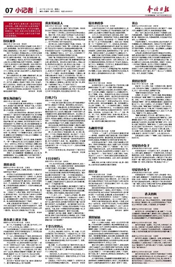 莼湖中心小学304班小记者 吴彦希 春天的风,是一种让万物复苏的风。你看它把枯黄的小草变成了嫩绿的小草,让光秃秃的柳树抽出了枝芽,还让大树的芽儿变嫩、小花更美丽、空气更清新…… 莼湖中心小学304班小记者 石雨欣 春天的风,有一双神奇的魔术手,看,他摸了一下小草,正在睡觉的小草就被叫醒了,嫩绿的小草从土里抬起头,四处张望;他轻轻地抚摸着桃树,桃树马上开出了粉色的小花朵;他轻轻抚摸着天气,天气渐渐的温暖起来了…… 莼湖中心小学304班小记者 梁喆 春天的风就像一盒颜料。吹过大树,大树变绿了;吹过小草,小草变绿了;吹过桃树,桃树花开了;吹过油菜花,油菜花开了,大地变成了五彩缤纷的世界。大青蛙呱呱的叫着、小鸟欢快的唱着,春天的风把所有的东西都叫醒了。 莼湖中心小学304班小记者 王棋轩 春天的风,就像是一位魔法师。你看,他把温暖给了小动物,小动物们都复苏了;他把暖风给了小河,小河里的冰都融化了;他把生命给了小草和大树,小草和大树又长出了嫩绿的叶子;燕子都从南方飞了回来,大家好像都在说:“春天真快乐!” 莼湖中心小学304班小记者 沈悦玲 春天的风吹到大树,大树的叶子被吹落到了大树妈妈的脚下;春天的风吹到小河,河上的冰给吹化了,小青蛙在河里跳来跳去;春天的风吹过大地,把小草吹弯了;春天的风吹到了小朋友的头上,小朋友的头发跳起舞来;春天的风吹到小花朵……