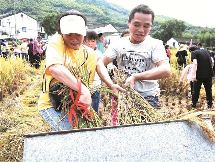 大堰镇金灿灿的稻田成了这个秋天最美的风景,10月以来,已有数百游客组团专程前来体验农家最原生态的割稻打谷。图为游客在南溪村体验割稻打谷。
