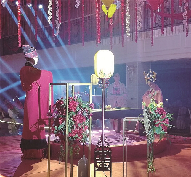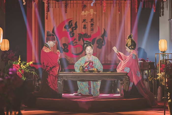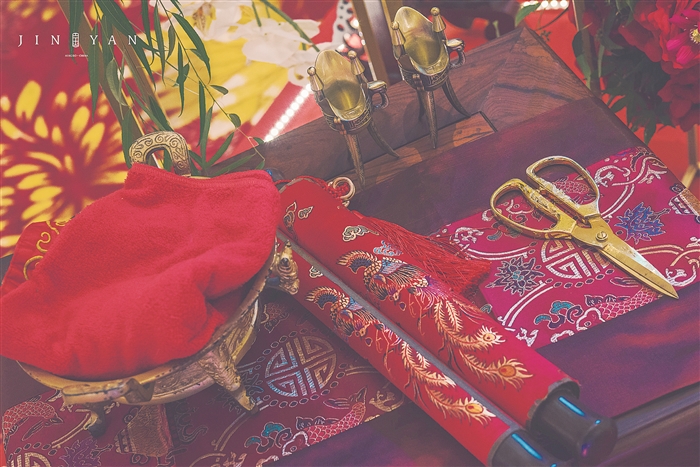 记者 陈培芳 红色纱幔,琴瑟和鸣,伴着悠扬的编钟、古筝乐曲,新郎新娘互行揖礼,幸福结发。相信很多人都在古装剧上看到过奢华、庄重的汉式婚礼,不少姑娘梦想着自己也能有这样一场婚礼。近年来,汉式婚礼逐渐在奉化的婚庆市场流行起来。 一场穿越古今的唐制婚礼 “煌煌华夏,悠悠五千,礼仪之邦,赤县神州。三牲备,礼服完,佳偶全,宾客齐,新婿新妇步入喜堂。”今年10月1日,随着赞者(司仪)的一段开场白,新郎胡先生和新娘季小姐的汉式婚礼拉开帷幕。 随后,婚礼依序进行,从“却扇礼”“沃盥”(新郎新娘引水沃盥,焚香净手,表达对婚礼仪式的尊重)“正冠整衣”“合卺同牢”(新人入席后,由侍者端上酒爵,酹洒爵中酒告谢天地。天地赐福,新人同食一牲之肉,同饮一匏中酒,象征从此福寿同享,甘苦与共)、“行结发礼”,再到最后告谢父母,大礼成,一个“穿越时空”的汉式唐制婚礼演绎得淋漓尽致。赞者主持婚礼时,语速缓慢平和,辞藻华丽庄重。章句取材于《诗经》《乐府》等古典名著,现场宾客直叹有幸感受一次千年前的浪漫,也重温了传统礼仪文化和孝文化。 新娘季小姐是一位高中语文教师,她从小喜欢国学,酷爱传统文化。此前,她偶尔看过到一些人穿汉服上街,就像少数民族穿本族服装参加庆典活动一样,“很多国家在婚礼上保持了自己原有的传统文化,如日本和韩国,他们传承的是我国唐朝和明朝的婚礼礼制,反而我们自己,在这方面不多见。”季小姐告诉记者,“结婚是人生大事,婚礼需要仪式感。虽然西式婚礼也浪漫唯美,但中华民族五千多年的传统文化博大精深,更注重仪式感,所以我举办了一场汉式婚礼,对于我而言,有着无法替代的意义。” 唯美庄重的汉式婚礼 近年来,越来越多的年轻人对“汉文化”、“汉礼仪”的认知度与日俱增,乞巧、祭月等传统活动在年轻人中流行。金宴中心的婚礼负责人毛迅仪告诉记者,不少年轻人开始追求传统婚礼文化,这两年来,奉化的汉式婚礼逐年呈上升态势,他们会接到布置汉式婚礼的单子。“同样规格的婚礼,汉式比西式的花费要高一些,因为汉式的婚礼细节要求更高。一般来说,对婚礼仪式比较有期待的新人会选择汉式婚礼,因为汉式婚礼庄严肃穆,更注重礼节。” 汉式婚礼是以古典主义为主要特征的当代新兴、时尚的婚礼形态。它不同于西式婚礼,也不同于以明清风格为主的一般中式婚礼。汉式婚礼以周礼为蓝本,以典雅、尊贵、庄敬为气韵,追本溯源,是真正体现华夏经典文化传统的民族婚礼。 “真正的汉式婚礼,它的华美、高端、尊贵、浪漫,不输于任何一种世界其它民族的婚礼。视觉上,汉式婚礼拥有令人震撼的美感。”宁波长乐未央婚礼策划工作人员苗描女士告诉记者,要举行一场完美的汉式婚礼,不仅在场地布置上有严格要求,而且新人的礼仪形态都需要经过专业训练,“目前来说,复原传统汉式婚礼,大致可以归纳为以先秦两汉为代表的周制婚礼、以魏晋唐为代表的唐制婚礼和以宋明时期为代表的明制婚礼,每个朝代的礼制都有区别,只有深入去研习,才能真正演绎好一场汉式婚礼。” 传统文化中,汉式婚礼被视为人伦关系和社会秩序的起点、人与自然阴阳相和谐而化生万物的本源。只有这样的婚礼,才足以同新人之间坚贞、深沉的情感相般配,才能同我们自身的民族身份和文化传统相般配。 (图片由受访者提供)