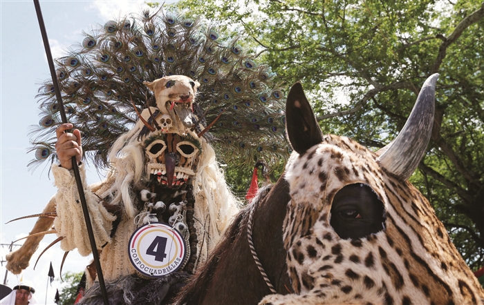 11月12日,在哥伦比亚的圣马丁,身着戏服的表演者骑马参加当地传统民间节日巡游。