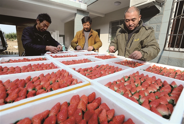图为该镇下王村草莓购销大户王春平(中)向40户农户收购的300公斤草莓正包装发往宁波花果山超市。