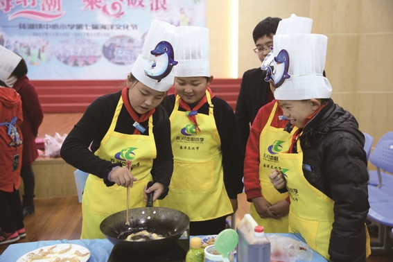 通讯员 马金山 只见锅铲在手中跳跃,不到几分钟,一盘色香味俱全的海鲜意面就呈现在观众与评委面前;虾经翻炒,再加茄汁,很快就变成了诱人的橙色,再上调料,以期待给味蕾更丰富的感觉,一份新鲜美味的“天外飞虾”就出锅啦……这里是“海鲜烹饪比赛”的现场,来自601班参赛选手王泽涛同学很出色地完成了海鲜意面、“天外飞虾”这两道家常菜。 近日,莼湖中心小学“悦海纳潮 乘风破浪”——第七届海洋文化节之海鲜烹饪比赛在学校报告厅举行。海鲜烹饪比赛共分五年级组和六年级组,每个班级选出3至5名选手参加比赛,自选配料,自定菜名,比赛时长20分钟,最终根据每个小组做菜时的表现和菜品的色、香、味进行综合评分。比赛开始,每个小组的选手们分工协作,有的切菜,有的做菜,有的摆盘,经过一番忙碌,一道道色香味俱全的成品就展现在大家的眼前,选手们对自己的作品都很是满意。气氛热闹非凡,小厨师们忙得热火朝天。 整个比赛现场,同学们融入其中,乐在其中。 置身现场的504班沈涛说,“比赛拉近了同学间距离,丰富了同学们的校园生活,让一些同学的厨艺获得了展示,更重要的是,大家更加理解了父母做家务烧饭的艰辛与不易。”