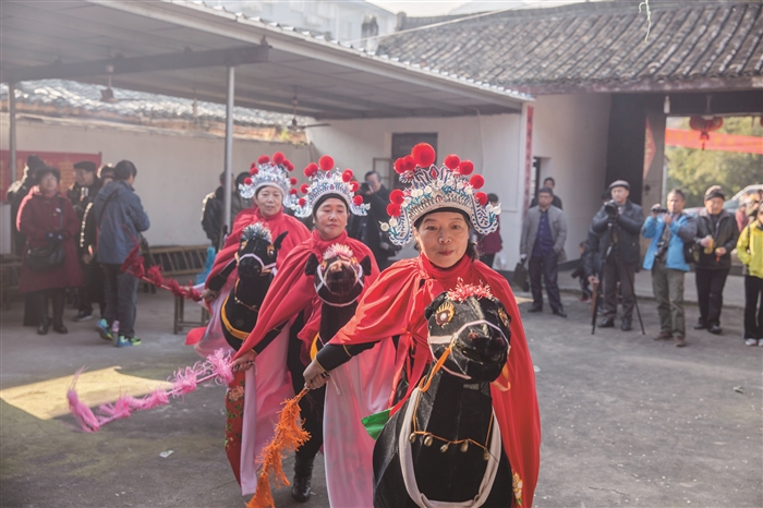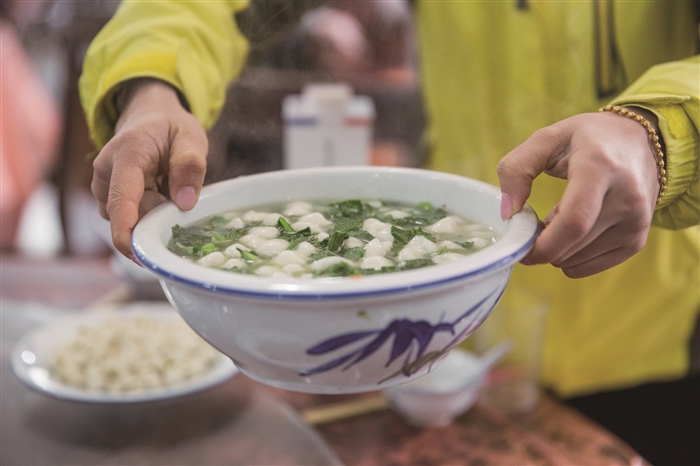 图为刚出锅的菜汤果 图为“跑马灯”表演 记者 王楷文 袁伟鑫 通讯员 何好斌 单许桓 本报讯 “冬至是传统24节气当中最为重要的节气之一,我们奉化更是用一句‘冬至大如年’的老话来形容冬至的重要性。冬至过后,就像一个新的开始,又是一番新气象。”前天上午,奉化老年大学民俗班的学生走进里应村,了解祭祖、裹“菜汤果”、跑马灯、洗脚等冬至习俗,体验回味奉化“老底子”传统习俗。 约80名老年大学学生用一首《歌唱祖国》大合唱为本次冬至活动开了个好头,在老人们嘹亮的歌声中,开始准备祭祖。“冬至祭祖是千百年来传承下来的一个习俗,今天,冬至已演变成百姓家庭团聚的节日,祭拜仪式早已简化,但这是一种乡土文化,也是孝道的传承,具有重要的意义。”省民间文艺家协会会员江圣彪告诉记者。老人们参加祭祖仪式后,被现场一个小小的石磨所吸引。在石磨中撒上糯米,在糯米中淋上少许清水,缓缓地顺时针推动石磨,乳白色的糯米粉与水沿着凹槽流到准备好的盆子中,记者了解到这是今天裹“菜汤果”的原料。江圣彪表示,奉化人过年要吃汤果,元宵节要吃元宵,但同样重要的冬至也要吃汤果,只是这个汤果是“菜汤果”,菜汤果就是指糯米粉搓成团,放置菜叶,与菜泡饭类似,吃菜汤果表示自己清白坦荡,能够交好运。记者采访了参与制作的孙先生,他表示自己小时候曾做过汤果,已经很久没有体验如此丰富的冬至习俗,要好好回味一番。 “在老底子的奉化冬至传统习俗中,最重要的是做一个美梦,美梦代表着来年的运势旺盛,做美梦的前提是要洗干净双脚。”江圣彪告诉记者。老年大学的学生替里应村老人们洗了头发与双脚,希望老人们能够在寒冬中祛除寒气,身体健康,并能在冬至做个好梦。值得一提的是,洗头与洗脚的物品也是奉化的“老底子”物品——槿头树叶洗头,桑叶洗脚。江圣彪表示,以前没有洗发露,人们洗头就需要槿头树叶来养护头发,去痒去屑,现在逐渐被洗发露代替,很少有机会回味这种纯天然的护发方法,而用桑叶洗脚更是能够让老人驱寒养身。 “以前过冬至只有上坟、修缮坟墓,祭拜祖先,很少能够看到今天这样丰富的活动。”今年82岁的里应村村民应先生表示,回味冬至的传统习俗能让大家不忘根本,在体验过程中也能给来年添个好彩头。