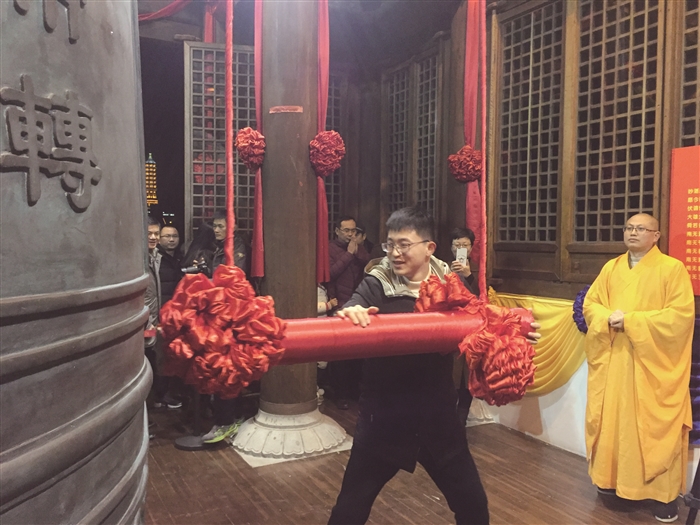 记者 俞加北 本报讯 1月1日零时零分,一声洪亮的钟声在千年古刹——雪窦山资圣禅寺敲响。当晚,在雪窦山上举行的元旦撞钟祈福活动,由市民、游客、僧众等共同敲响新年钟声,祈愿世界和平、国富民强、社会和谐、人民安乐。 “迎新撞钟”是中华民族辞旧迎新,祈求吉祥平安的传统文化活动。每年的元旦、除夕,作为中国佛教五大名山之一,雪窦山都会举行迎新撞钟活动。昨晚,千余名市民和从上海等地远道而来的游客参加了撞钟祈福活动,他们为自己求健康、为家庭求平安、为未来求好运,共同祈祷在新的一年里平安吉祥,万事如意。 当晚,雪窦山上还举行了迎元旦文艺晚会,为到场的市民和游客献上一场文化盛宴。 敲响钟声为新年祈福。 记者 王红雨 摄