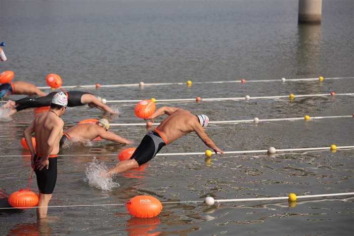 ◀昨天下午,浙江省冬泳系列赛奉化站暨区第二届剡江杯公开水域冬泳赛在剡江萧王庙段举行,来自全省游泳协会、俱乐部的14支队伍参加了10×150米的冬泳竞速赛,200多位冬泳爱好者畅游剡江。
