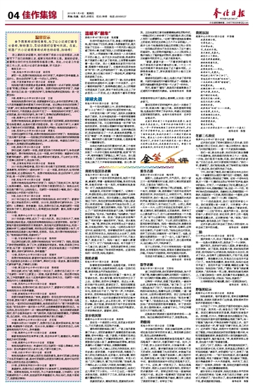 实验小学302班小记者 徐子起 在一个阳光明媚的上午,老师带领着我们这群“小斗士”举行了一场别开生面的球球大战。 只听老师大喊一声“开始”,我和队友就默契地动了起来。队友快速地抓起一个海洋球接着微微弯曲膝盖,在眨眼间他突然像弹簧似的跳了起来将球抛向了我。只见海洋球就像一枚子弹飞快地向我射来。我仰起头眼睛牢牢地盯着海洋球,身体随着球的位置不停地移动着。当球快靠近我时,我猛地向前迈了一大步,高高地举起箩筐,只听见“噗通”一声,球就像一个调皮的娃娃跳进了框里。瞬间我的心里充满了成就感,心里就像喝了一大罐蜜糖似的。 当我还沉浸在成功的喜悦中时,第二个海洋球就像一头猎豹已经闪到了我的眼前。我赶紧向后退了一大步手忙脚乱地举起箩筐,结果“咚”的一声,海洋球撞在了箩筐边上,弹了出去。我心里失落极了,而海洋球似乎也在嘲笑我似的,调皮地在地上跳了几下并骨碌碌地转着圈。我心想:原来接海洋球也并不是那么简单啊,以后我一定要多练习。 最后在同学们的呼喊声中,我们一共接住了13个球,我高兴得一蹦三尺高。虽然接海洋球很难,但是给我们带来了许多快乐,希望以后还能玩这些有意思的游戏。金笔作文指导老师 竺伊莎 金笔点评: 这篇文章体现了小作者较强的观察力、语言组织及表达能力。文章中的动作描写得十分到位,一步一步详细地描述了当时的动作细节,并运用了许多修辞手法,让人物更生动的同时也赋予了海洋球生命,给我们呈现了一个调皮可爱的海洋球。最后主人公的心理变化和真实感受也较为简洁明了,并告诉了我们想要完成一些小事也并不是那么容易的,还是需要多加练习。希望小作者再接再厉,创作出更多优秀的文章!