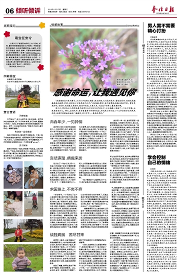 □西河 兰馨,你说你是一位二胎妈妈,有对可爱的儿女,大宝读小学,小宝读幼儿园,孩子可爱活泼,丈夫又善解人意,自己一直很幸福。但是近两年,你却越发地控制不住自己的情绪,因为两个孩子先后入学,让你原本安逸的日子渐渐有了变化,动不动就冲孩子发脾气。 兰馨,你说你每天都处于紧张的状态,一大早要伺候两个孩子起床吃饭上学,孩子稍微磨蹭一点,你就会对他们大吼大叫,当孩子玩耍把家里弄得一团糟时、当孩子做作业时思考半天却写了错误答案,当丈夫下班回家只顾自己玩手机时,你都会控制不住,时间久了,老公孩子都逐渐怕你,甚至疏远你。兰馨,你说其实每次吼完孩子,你的心里总是满满的后悔和罪恶感,并暗自发誓下次再也不会这样,但是到了下次,你还是会这样,你知道这样不好,但是总是控制不住。 兰馨,首先我想问你一个问题,吼就能教育好孩子吗?我们总是习惯于对家人大喊大叫,指责而不去理解,命令而不去沟通,不懂得道歉。我们都觉得自己已经为家庭生活付出了太多,却忽视了最关键的一点:有效沟通。兰馨,你要知道,带着情绪解决不了任何问题,当你冲着孩子吼叫时,孩子大脑会自动转入逃生机制:“骂完就过去了。”等到次数多了,孩子已经免疫了,根本不在乎你说了什么。而且,如果父母带着攻击性的言语,很容易摧毁亲子之间的信赖和尊重。父母情绪很糟糕时,是无法教会孩子任何道理的。 兰馨,我想对你说,学会控制自己的情绪,保持乐观快乐的心态,是妈妈对孩子最好的教育,当你下次想发脾气的时候,你可以先问自己几个问题,给自己一个心理的冷静时间:我为什么会生气?我弄清楚真正的原因了吗?除了冲他们发脾气,没有其他办法了吗?有了诸如此类的心理对话,才能唤回理智,冷静交流。当然,偶尔的情绪失控不可避免,那么事后懊恼时一定记得对孩子说对不起,以及我爱你。