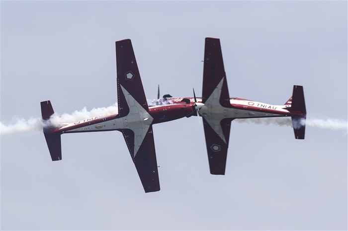 2月11日,在新加坡航展上,印度尼西亚空军飞机进行飞行表演。