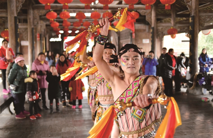 2月12日,在湖北省宣恩县城,土家幺妹儿艺术团的演员们表演“八宝铜铃”。 春节临近,湖北省恩施土家族苗族自治州宣恩县土家幺妹儿艺术团的演员,忙着为当地城乡居民演出“八宝铜铃”“滚龙连厢”等非遗文化精品,喜迎新春佳节。 土家幺妹儿艺术团是一支拥有159名团员的民间艺术团休,团员有农民、个体户、待业青年、机关干部等,每年在城乡义务演出上百场次。他们不图回报,图的是有一方舞台展现自己的兴趣爱好,用自己的歌舞为城乡群众带来快乐,用自己的行动把土苗山乡的非遗项目代代相传。 据了解,土家幺妹儿艺术团是宣恩县78个民间艺术团体之一。民间艺术团体作为活跃在土苗山乡的“文艺轻骑兵”,成为丰富城乡群众文化生活重要的民间力量。 新华社发