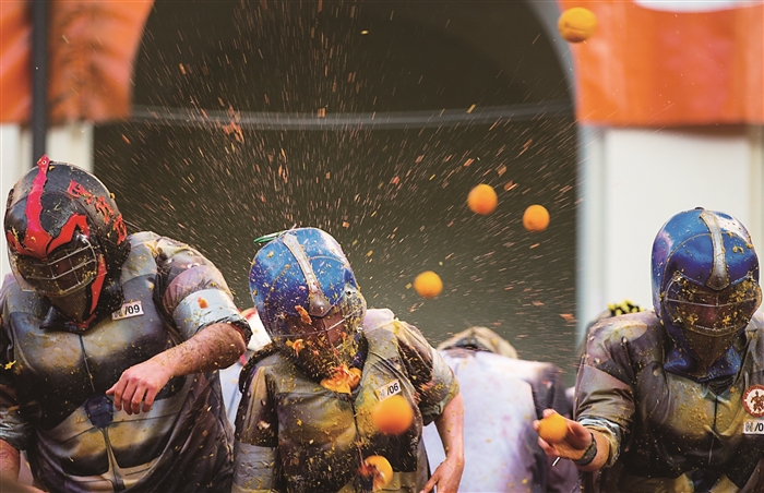 2月12日,在意大利小镇伊夫雷亚,人们参加“橘子大战”。2月11日至13日,伊夫雷亚镇举行一年一度的“橘子大战”狂欢活动。