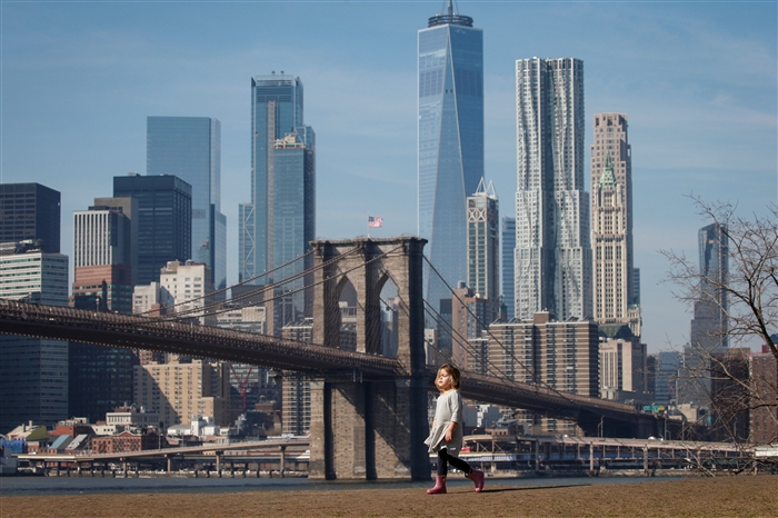 2月21日,在美国纽约布鲁克林,一名女孩走在草地上。