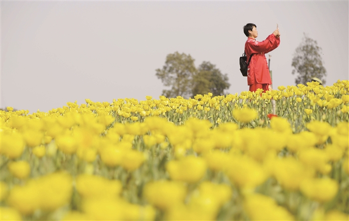 3月3日,游客在江西省新余市一植物园拍摄郁金香。
