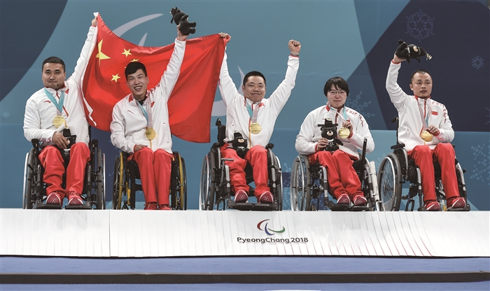 中国代表团实现冬残奥会金牌零突破!17日,在2018年平昌冬残奥会轮椅冰壶决赛中,中国队通过加时局以6:5险胜挪威队,奋勇夺冠。 这也是中国代表团在历届冬残奥会上夺得的首枚奖牌,一枚金色的奖牌! 拔杆,俯身,深呼吸!凝神,屏息,稳推杆! 八局过后双方战成5:5平后,四垒王海涛在加时局坚定地掷出中国队全场最后一投,红色的冰壶在江陵冰壶中心赛道上匀速滑行,封死对手进攻路线。挪威队聚在一起望着冰面从各个角度仔细研究后,无奈放弃最后一壶,向中国队员们握手道贺! 喜极而泣的岳清爽跳下教练席,跑过冰面,将两面国旗交到队员手中,张强、王蒙、刘微、陈建新和王海涛将鲜艳的五星红旗高高举起,全场欢声雷动! “中国队,金牌!金牌!金牌!” 这是一场令人窒息的比赛!两队比的是技术,但更多的是心理。赛前,岳清爽与队员们围成一圈,紧紧拥抱,击掌加油鼓劲。场上,每次投壶完毕,四名队员都要击掌相庆。 王海涛说:“我们是一个集体,大家互相支撑着走到今天,特别不容易。高兴,真的高兴,拿到这枚沉甸甸的金牌!” 中国队一路过关斩将,12支队伍中位列第三晋级四强,小组循环赛曾10:1大胜挪威队。半决赛1分险胜三届赛事冠军加拿大队后,中国队满怀信心挺进决赛。 当晚,中国队获得梦幻开局,首局以2:0获得领先。挪威队随后反击,先是第二局拿下1分,接着第三局连续投出几个落点刁钻的壶。王海涛无奈奋力一搏,一只黄色冰壶被击打后鬼使神差般进入中心区,挪威队3:2反超比分。好在,第四局,后手的中国队稳扎稳打,以3:3战平结束上半场。 随后两局,挪威队拿下1分。第七局,挪威队出现两次击打失误,中国队趁机以5:4反超。第八局,挪威队二垒、三垒连续失误,中国队两只红壶形成牵制,挪威队依靠打甩艰难拿到1分,战成5:5平。 加时局中,陈建新在投中国队第五个壶时放手一搏,奠定胜局。 岳清爽说:“那个壶投进去非常关键,陈建新做到了。金牌我们很不容易拿到了,从现在开始放下这些,更好备战2022在家门口的比赛!” 加拿大队以5:3击败韩国队,夺得铜牌。 这是中国代表团第五次参加冬残奥会,也是中国轮椅冰壶队第二次冬残奥之旅。中国轮椅冰壶队2014年在索契获得第四,那也是中国代表团在此前历届冬残奥会上的最好成绩。 新华社平昌3月17日电 中国队队员王海涛、陈建新、刘微、王蒙、张强(从左至右)在颁奖仪式上