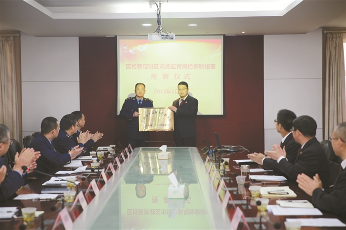 通讯员 林杰荣 本报讯 3月9日,区检察院派驻区市场监管局联络室正式挂牌。 为更好地开展市场监管工作,同时充分发挥检察机关法律监督职能,共同维护和促进市场监督管理工作依法、规范、高效地运行,经过一个多月的协商,该院和区市场监管局会签《关于建立和加强市场监督管理与检察监督协作配合机制的意见》,并成立检察院派驻市场监管局联络室。 该院还与区市场监管局建立信息通报、事先告知、提前介入、联席会议、联合调研等五项具体的协作配合机制,并派专门的联络员定期驻点检察联络室办公,及时总结工作开展情况并研究确定下一步监督重点。 授牌仪式现场