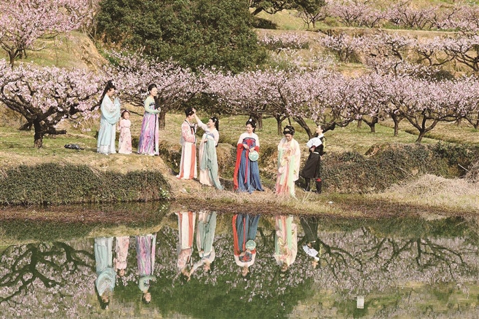 ◀日前,在林家村天下第一桃园内,游人如织,桃花林中10多名汉服爱好者组织了一场“撷一缕幽香 采一程芳华”的汉服同袍戊戌花朝节桃园游春会,身着各色汉服的汉服爱好者成为桃林中一大美景。