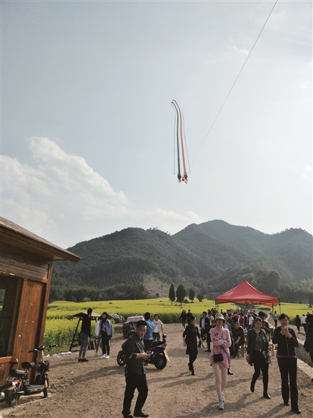◀近日,莼湖镇缪家村乡贤——国家级非物质文化遗产“曹雪芹风筝”传承人缪伯刚来到溪口镇新建村,现场为游客展示放飞了“双飞比翼”风筝以及长达66米的“长龙”风筝,为家乡桃文化宣传贡献力量。记者 景小芳 通讯员 吴余