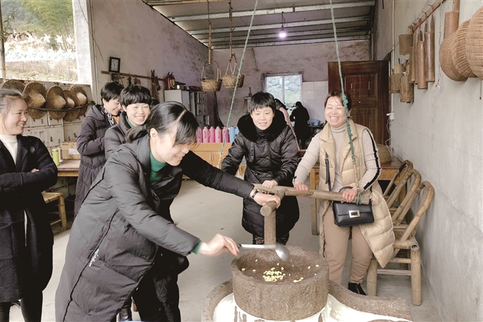 图为齐心协力磨豆浆。