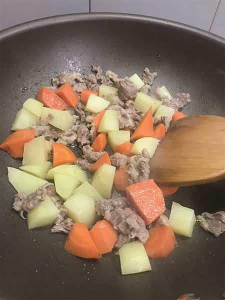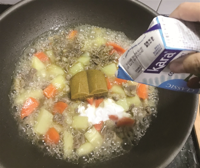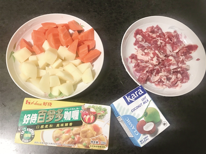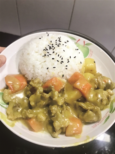主料: 牛腩250g、土豆一个、胡萝卜一个、咖喱、椰浆 步骤: 1.牛腩切薄片,土豆、胡萝卜洗净切相同大小的块。 2.牛腩加料酒、茴香、生姜去腥焯水,捞出。锅内重新加水,沸腾后加入牛肉炖30分钟,直至熟软。 3.另起一锅,加入适量的油,将胡萝卜和土豆翻炒至8分熟,然后加入牛腩一起翻炒。 4.加水至没过食材,煮至所有蔬菜变软。 5.加入两块咖喱和椰浆,搅拌均匀防止黏锅,等咖喱汁粘关火出锅。 6.最后装盘,小碗盛饭倒扣在盘子里,撒上黑芝麻点缀,一碗好看又好吃的咖喱牛肉饭就做好了。是不是很有食欲啊! 备注:这个菜谱做的是一个人的分量,可根据实际情况自己调节,咖喱本身是有咸味的,所以在制作过程中没有加盐。 制作人:网友“独木成林”
