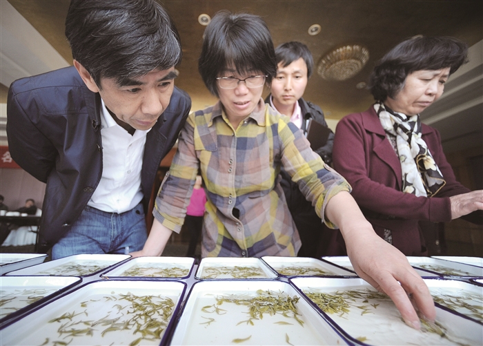 记者 徐华良 通讯员 王礼中 本报讯 “这次参加名茶打擂,我精心炒制了奉化曲毫,争取夺得好名次。”尚田安岩茶场场长黄善强表示。昨天,第五届“奉茶杯”名茶评比评鉴会举行,由区农林局和区茶文化促进会主办,区雪窦山茶叶专业合作社承办,吸引了全区20名制茶高手36只名茶样品参赛。尚田安岩茶场选送的奉化曲毫和弥勒白茶均获得冠军,雨易茶场选送的奉化曲毫和蟠龙茶场选送的弥勒白茶分别获得第二名。 评鉴会邀请了国家著名评茶专家、浙江大学茶学系教授龚淑英,中华全国供销合作总社杭州茶叶研究院研究员朱跃进,宁波市林业局副局长林宇皓等专家组成茶叶评审组,对奉化曲毫和弥勒白茶的外形、汤色、香气、滋味和叶底分别进行严格打分。 评鉴会上,龚淑英对奉化曲毫和弥勒白茶作了点评。她表示,今年,奉化曲毫和弥勒白茶在外形和内质两方面实现了新突破,相信会在全国“中绿杯”名茶评比中再创佳绩。 图为专家在评审参赛的名茶样品。记者 王红雨 摄