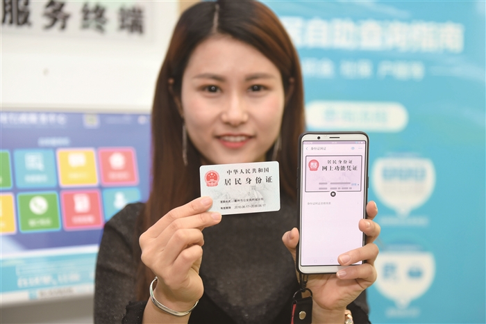 4月17日,在浙江省衢州市行政服务中心,市民蒋女士展示在支付宝手机客户端上领取的“居民身份证网上功能凭证”。