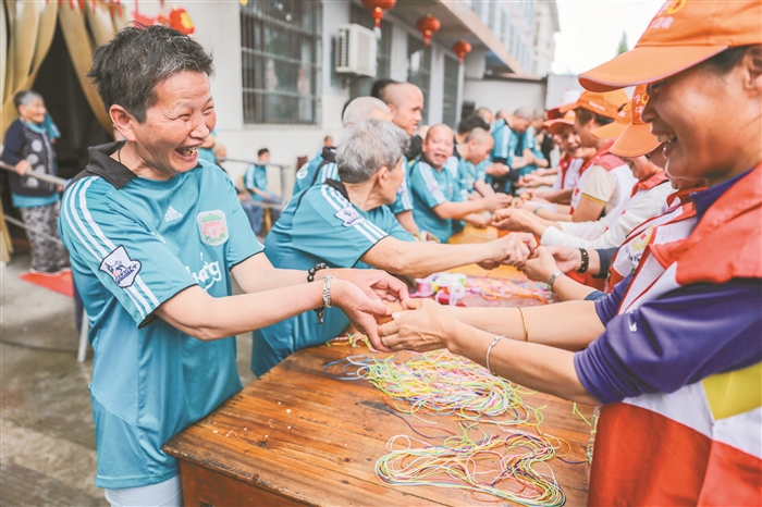 5月2日,区红十字博爱志愿服务队的15位队员来到溪口普天乐健康乐园,同这里的40多位老人、智残人士一起包青团、拄蛋、串蚕豆,过一个愉快的立夏。图为志愿者和老人进行拄蛋比赛。