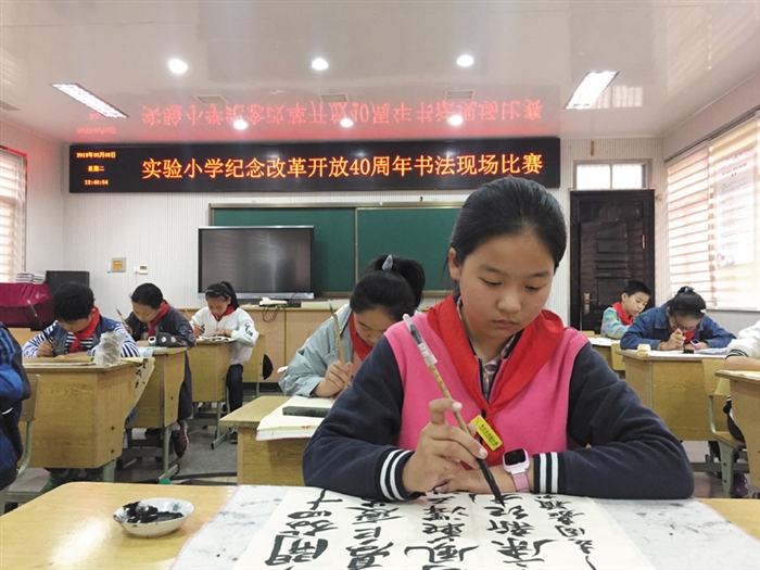 通讯员 杨金欢 2018年是我国改革开放40周年。为了进一步贯彻、落实党的十九大精神,学习、领会习近平新时代中国特色社会主义思想,全面回顾改革开放40周年的伟大历史进程,歌颂在改革开放实践中所取得的伟大成就,实验小学近期举行了改革开放40周年书法现场比赛。本次书法比赛共收到112幅作品,经过评选,45位选手参加现场比赛,最后评选出一二等奖。 学校希望通过参加本次以改革开放为主题的书法比赛活动,同学们对书法有更深刻的理解,也为他们能更好地弘扬改革开放精神,唱好社会主义主旋律,提升文化自觉,增强文化自信,培养爱国主义情怀奠定坚实基础。
