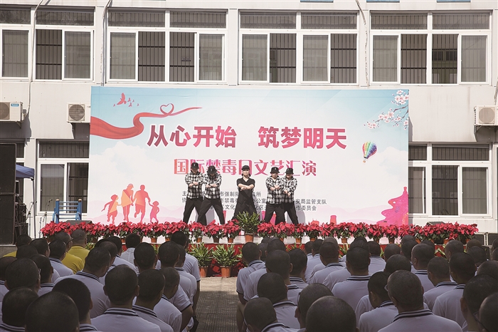 记者 蒋凯 袁伟鑫 通讯员 王继忠 李则琴 本报讯 昨天,“从心开始、筑梦明天”6·26国际禁毒日文艺汇演在宁波市强制隔离戒毒所大院内举行。 由管教民警和戒毒学员自编自导自演的10余个节目精彩纷呈。《中塔路65号》小合唱唱出了戒毒学员对管教民警的感激,诗朗诵《牵挂》表达了戒毒学员对亲人的思念,《戒毒三字经》说出了戒毒的好处,还有《日不落》《明天会更好》等舞蹈节目赢得了在场学员们的阵阵掌声。演出期间,区关工委将精心挑选的200余本阳光好书捐赠给戒毒所。 图为宁波市强制隔离戒毒所学员在表演文艺节目。