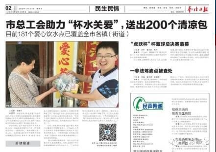 记者 沈珞 本报讯 和过去5年的每一个高温天一样,昨天早起开门后,广平路唐狮专卖店的业主王安钢仔细检查了饮水桶的水是否够用,以方便环卫工人进来喝水。从2013年参加本报发起的“一杯水清凉一座城”公益活动后,他的店就成为环卫工人的免费饮水点。 一杯水 唤来八方热心人士 2013年7月11日,本报第2版刊登《关爱,从一杯水开始》,发起为环卫工人设立免费饮水点征集公益活动。当年获知该消息后,当时位于大成路的宁波春光节能科技有限公司积极响应,成为本次活动的首家免费饮水点。公司一位员工至今还记得标识贴出后当天上午10时多,就有两位环卫工人进门来喝水,那时他们还很腼腆,后来渐渐跟工作人员熟了。 “一杯水”活动推出的当年,市民反应热烈,有78家爱心饮水点设立,有的是商家,有的是个人,也有的是沿街的一些单位。2014年爱心饮水点为98家,2015年181家,2016年165家,2017年达到了200多家。 2015年88家体彩营销点加入后,城区的福彩和体彩销售点都成为了“一杯水”活动的成员。从当年起,区总工会连续3年为饮水点送去500多个便民药箱和清凉包等消暑用品。也是从2015年起,热心老人张碧雨多次通过本报向环卫工人捐款慰问。惠政西路63号的丁萍秀阿姨的爱心饮水点,上个世纪七八十年代常见的路边茶摊被她复制到了楼道,只不过是免费的。一到天热,她就在楼道口放个茶桶和杯子,每天烧水,很多邻居都来帮忙,只是去年得悉面临拆迁,她家搬到城里厢就把茶桶撤了。2017年,中国银行携手区慈善总会和本报为环卫工人们定制了1000个公益水杯。金都广告设计公司和印都图文社都曾主动联系本报免费承印饮水点标识。5年来,本报每年有10多位报春花志愿者参与这项公益活动,推出了60多篇报道和微信推文。 小善举 清凉环卫工的酷暑 记者昨天驱车在城区转了一圈,在广平路、惠政路、中山路、长春路,依然可以见到有多家贴着标识的饮水点。不少饮水点已经把酷暑为环卫工人供水扩大到冬天供应热饮水,有的还自备消暑药品等常用药。 昨天记者联系了曾在东门路清扫的环卫工王利月,她去过该路段的爱心饮水点,现在调到体育场路的她告诉记者,爱心饮水点让她更感受到做环卫工人这份职业是受人尊重的,希望附近也有爱心饮水点。在大成路清扫的环卫工江信伟至今还记得第一次进饮水点时的那份不确定的心情,“那时觉得自己满身尘土,去人家这么干净的地方不好意思。” 记者联系区环卫管理处副处长董建红得悉,“一杯水”活动开展以来,有近千位环卫工人受益,“平常也听他们在说起哪里可以免费饮水。”但因为环卫工人有流动性,也有部分人员对此不知情。 在城基路和锦屏南路岔口,今年3月到岗的环卫工人王仁恩就对此不知情,他告诉记者,前些天高温时,他每天都要带4大杯的水来上班,记者看到他的杯子容量都在500毫升以上。“如果附近有爱心饮水点当然好了,过阵子天热更需要。”在中山路,记者遇到的环卫工人陈阿姨,也对这个活动不知情。当记者为她指了几个附近的饮水点时,她连声称好,表示以后会去的。 此外,在舒前村、舒后村、吴墩村和金海路附近,有饮水点标识的地方记者极少见到。有些路段的饮水点由于搬迁等原因,已经不存在。记者随机联系了几家商铺,有的对活动表示欢迎,有的对活动也存顾虑,如担心让环卫工来休息,别的顾客会有想法,或者因为小本生意担心每天供水会有压力。 期待您 一起参与“一杯水”活动 下周开始就要迎来三伏天,奉化的城区也在不断扩大,为了给更多户外劳动者提供免费饮水点,今年,本报将继续开展“一杯水清凉一座城”活动,愿意为户外劳动者提供免费饮水点的商家、市民,请拨打本报新闻热线88987777,和我们联系。本报期待热心公益的您一起参与,为可敬的环卫工人、奔波的快递小哥等户外劳动者送上一份清凉。 图为本报“一杯水”活动标识和以往报道。