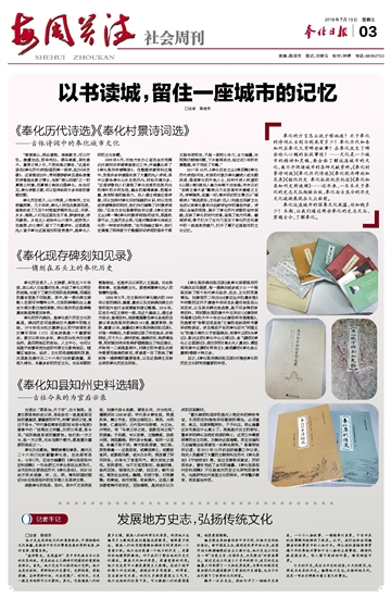 □记者 陈培芳 奉化的方言怎么说才够地道?关于奉化的诗词从古到今到底有多少?奉化历代知县知州在奉化又有哪些故事?在奉化发生了哪些动人心魄的抗战事迹?……文化是一个城市的精神和灵魂,要全面了解这座城市的文化,离不开阅读城市的各种文献资料。《奉化村景诗词选》《奉化历代诗选》《奉化现存碑刻知见录》《铭记历史 奉化抗战纪实纪念》《奉化知县知州史料选辑》……近年来,一本本关于奉化的史志文丛相继出版,奉化由古至今的历史文化逐渐展现在大众面前。 奉化这座城市的深厚文化底蕴,你知晓多少?本期,让我们通过那些奉化的史志文丛,穿越古今,了解奉化。 《奉化历代诗选》《奉化村景诗词选》 ——古体诗词中的奉化城市文化 “漠漠高山,深谷逶迤。晔晔紫芝,可以疗饥。唐虞世远,吾将何归。驷马高盖,其忧甚大。富贵之畏人兮,不若贫贱之肆志。”这是收录在《奉化历代诗选》里的第一首诗,名为《采芝歌》。这首简洁古朴,带有楚辞韵味且通俗易懂的诗歌是由秦之博士,世称“商山四皓”之一的夏黄公所著,而夏黄公晚年归隐奉化。由此可见,奉化诗歌之源,可以延伸到两千多年前的秦朝时期。 奉化历史悠久,山川秀美,人物钟灵,文化底蕴深厚。几千年来,奉化人民在此聚族而居,逐渐形成了几百个村落星罗棋布在山区、平原、水乡、海滨,人们在这里生生不息,耕读传家,诗风蔚然。乡邑文人或咏吟山川草木,或抒发人生感想、内心情怀,留下了大量诗作。这些都是先人留予奉化这座城市的宝贵遗产,是奉化人民的文化珍藏。 2009年4月,市地方志办公室在全市范围内开展民间宗谱调查登记工作,并编纂出版了《奉化现存宗谱辑录》。在整理宗谱资料过程中,发现许多宗谱里收录了大量的先人诗词,其中以歌咏奉化山水自然风光、民俗风情为多。“这些诗歌向人们展现了奉化优美的自然风光和淳朴的乡民生活,蕴含的感情真挚、哲理丰富,具有较强的感染力。后人通过阅读这些诗歌,可以加深对奉化旧时面貌的认识,所以在完成宗谱辑录的同时,我们另行编辑了《村景诗词选》。”区志办主任陈黎明告诉记者,《奉化史志文丛》第一辑《奉化村景诗词选》的成书,既是机缘巧合,又是历史必然,它是对辑录奉化传统文化的一种尝试和探索。“此书选编过程中,我们还偶遇了同样致力于整理民间诗词的退休干部王昌华老同志,于是一起同心协力,合力编纂,共同探讨疑难问题,下乡查阅走访,经过近5年的收集整理,终于完成了书稿。” 2017年10月,《奉化史志文丛》第四辑《奉化历代诗选》问世,收录的对象为奉化籍诗人或长期旅居、隐居奉化的外地人士,如宋代诗人林逋的《山园小梅》被后人誉为咏梅千古绝唱;宋末元初“东南文章大家”戴表元力主改革宋末萎蔽之文风,诗律雅秀,名重一时;清末民初的王慕兰以“闺阁诗人”闻名浙东;王任叔(巴人)则是五四新文化运动以来奉化最早开启新诗创作的著名作家。诗选以全域的视角,展示了奉化历代诗歌的创作面貌,反映了奉化的时代变革,呈现了地方风情。翻阅诗词,等于打开了古代乃至当下奉化历史长廊中的一扇扇奇异窗户,打开了属于这座城市的文化记忆。 《奉化现存碑刻知见录》 ——镌刻在石头上的奉化历史 奉化历史悠久,人文渊薮,早在五六千年前,茗山后人已经繁衍生息,开启了奉化文明史的进程,也留下了蔚为可观的各类碑碣,而埋没的墓志更是不可胜数。其中,除一部分碑文被载入史册可作稽考以外,已知的碑碣和出土墓志大部分都已难觅踪影,所以现存的这些碑碣墓志就显得更加珍贵。 奉化的历代碑刻,是奉化悠久历史文化的彰显,碑刻历史可追溯到汉代墓葬中的铭文砖,1978年在白杜汉墓群出土的宁波首枚东汉熹平四年(175)买地券就是一个重要标志。秦汉以来800多年,奉化的白杜作为古鄞治所,是四明地区的政治、人文中心,也可以说是宁波最早受先进的中原文化影响地区。随着区域政治、经济、文化的迅速崛起和发展,尤其是自唐开元二十六年(738)析鄮建置,其悠久绵长、丰富多彩的历史文化,无论早期的青瓷窑址,还是宋元以来的人文昌盛;无论弥勒故事,还是佛教文化,都浸润着奉化先人的智慧和创造。 2006年8月,市文保所对奉化境内的1949年以前的碑刻、摩崖、墓志以及反映碑刻碑文内容的拓片进行全面调查和登记整理。2016年,区志办与区文保所一起,在这个基础上,通过多方走访,查阅史料,选录整理散在奉化各地的自唐以来各类现存的碑刻143通,重要桥联、柱联、摩崖25处,编纂成《奉化现存碑刻知见录》,对每一种碑刻,大都详细记录了所在地点、形制特征、尺寸大小、碑材质地、建碑时间、残损情况等,同时就如何采取保护措施提出了相应建议,并附有一二帧现场照片,对碑文的作者及内容作简要而准确的叙述,使读者一目了然地了解到每一通碑碣的重要信息,以及这些碑文反映出来的奉化历史及民俗。 《奉化现存碑刻知见录》是奉化首部现存历代碑刻总目提要,每一通碑刻或多或少从一个侧面反映了那个年代奉化经济、社会、文化的发展情况。如唐宝历二年(826)《唐应辿夫妇墓志铭》中所载的应氏于唐建中年间自永康迁徙至名山后史实,以及其卒葬古地名等,是不可多得的珍贵史料。同时期出现的唐大中五年(851)《唐岳林寺造塔记》和大中十年(856)《唐岳林寺造塔铭》,则是素有