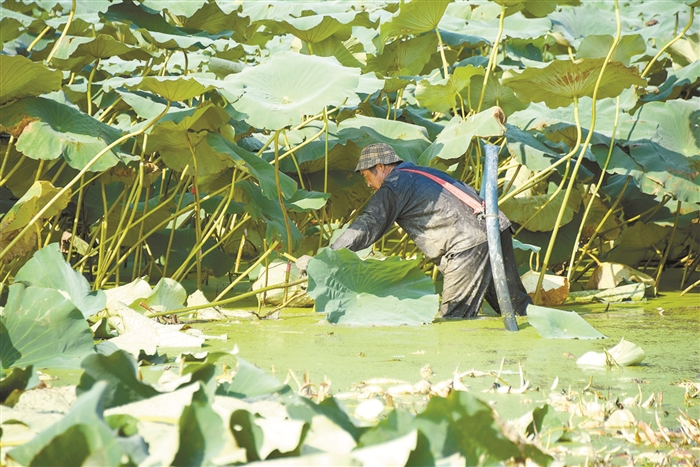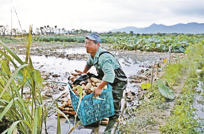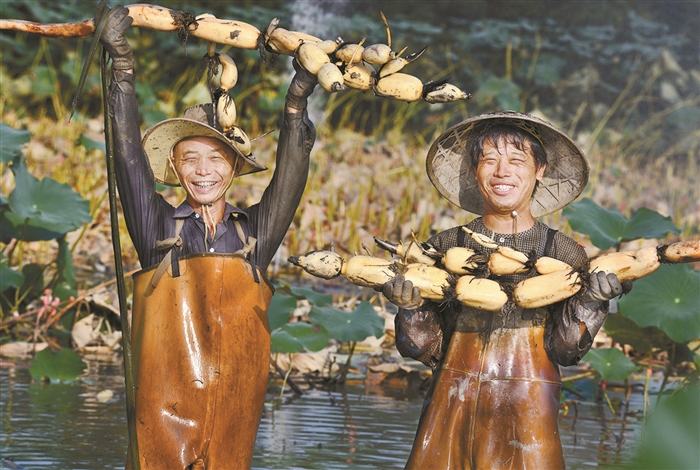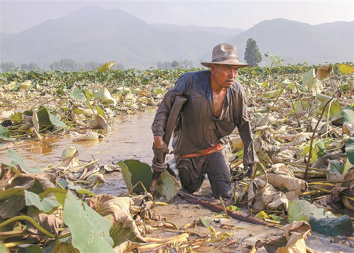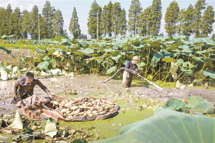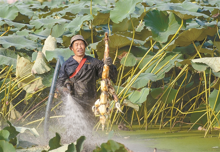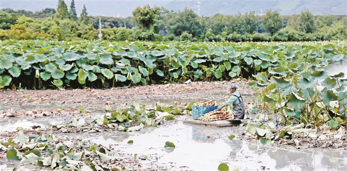 民谚说:“荷莲一身宝,秋藕最补人。”眼下正值时令鲜藕上市,也是吃藕的大好时节。 藕,睡莲科植物莲的肥大根状茎,故又称莲藕。《尔雅·释草》中曰:“荷,芙渠,其实莲,其根藕。”莲藕微甜而脆,可果蔬兼用。为果生吃,或当蔬熟食,皆鲜美可口,饶有风味。 要想品尝到美味的莲藕,就得有人先挖藕。烈日当头的三伏天里,西坞街道虎啸刘村的那一片莲藕田里,喷水发动机砰砰作响,藕田被搅起一层层闪亮的水花。循声望去,远处几名挖藕师傅几乎整个身体都浸泡在藕田的浑水中,只露出半张脸。 虽是盛夏,但挖藕师傅们却穿着长袖的秋衣。他们不时地俯着身、弯下腰,下巴挨着水面,右手握着一把高压水枪,左手摘掉莲叶,而后顺着莲梗抓住泥下的莲藕,再用高压水枪把莲藕上的泥冲洗下来。挖藕的过程,快则数十秒,慢的时候则需要数分钟。 据了解,目前挖藕工作没有一套机械化可以代替,基本都是靠人工来完成,挖藕人所付出的体力劳动非常大。 藕池 随缘夏叶仁 摄 洗藕 孙荷叶 摄 卖藕 汪武首 摄 忙碌 王苏达 摄 拉水带 袁宏良 摄 莲叶何田田 雪窦山水 摄 找藕 千里马 摄 收获满满 随缘夏叶仁 摄 挖藕工 袁宏良 摄 快乐的藕哥俩 方亚琪 摄