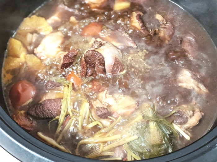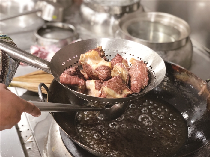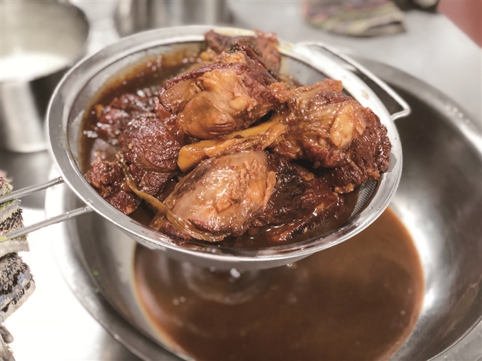 果味牛肉,顾名思义,牛肉中带有果香。这道菜食材普通,但很讲究选料,讲究火候,讲究调配。做了25年厨师的蒋仁云表示,这道菜他研究了多年才有现在这个味道。这道菜选材最为重要,脂肪沉积均匀的位置为佳,如牛腱子、牛里脊等。肥瘦相间的肉经过焖炖后,脂肪中的胶原蛋白会慢慢转化为天然的胶质,肉质Q弹多汁,汤汁更加醇厚。果味牛肉,是充分考虑了江口的地域特色和牛肉劲道的口感,独特的鲜香决定了这道菜的与众不同。这种炖烤法也可适用于鸭肉等其他肉类。