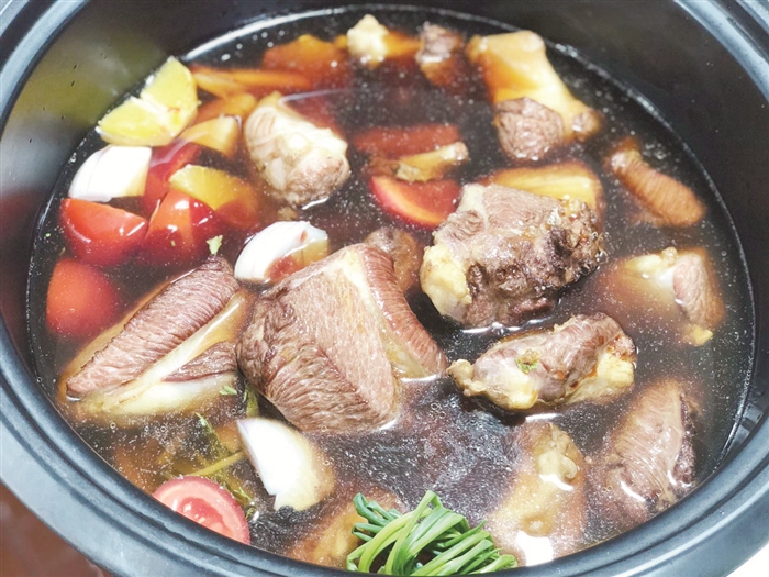 2.5公斤牛肉炖烤3小时后,美味的果味牛肉就炖烤好了。独特的香气吸引了不少“吃货”前去品尝,“多种食材混搭的果味牛肉味道确实不错,香而不腻,很适合现在吃,厨师很会创新!”一位品尝过的“吃货”说。