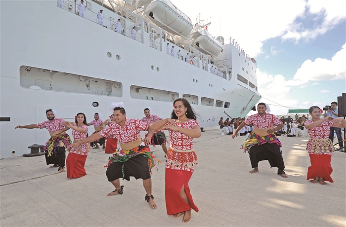 8月13日,在汤加努库阿洛法港,当地民众跳起传统舞蹈,欢迎中国海军和平方舟医院船到访。