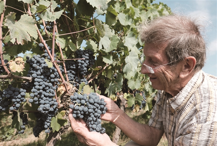 9月12日,在比利时萨尔拉布吕耶尔,酿酒师查看葡萄长势。
