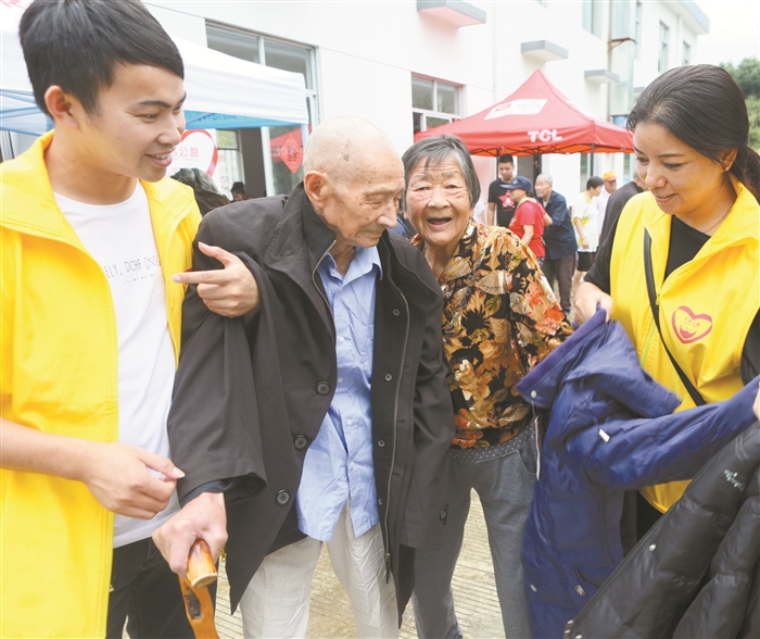 图为敬老院的王永兴夫妇穿上志愿者送来的衣服
