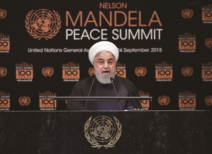 9月24日,在位于纽约的联合国总部,伊朗总统鲁哈尼在曼德拉和平峰会上发言。新华社发