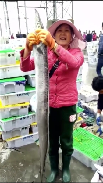 记者 徐华良 通讯员 袁盈波 本报讯 昨天早上,莼湖镇栖凤村一位姓沈渔民把一条长1.6米、重3.5公斤的特大带鱼,以300元的价格卖给城区一位姓陈的水产经营户。据当地一位渔民称,这么大的带鱼非常稀罕。 10月13日清晨,编号为11055-56的浙奉渔渔船在东海海区撒网捕渔,起网时这条特大带鱼夹杂在其中,让渔民眼睛一亮。这条锃亮的特大带鱼属正宗东海带鱼。昨天早上,当这条特大带鱼在栖凤码头一亮相,就吸引了前来采购的客商,最后被一位姓陈的经营户以300元的价格买走。 据区渔业执法大队副大队长孙道平介绍,由于东海伏休时间延长,带鱼休养生息,近期捕到的鱼个头明显偏大。 图为陈女士在展示“带鱼王”。