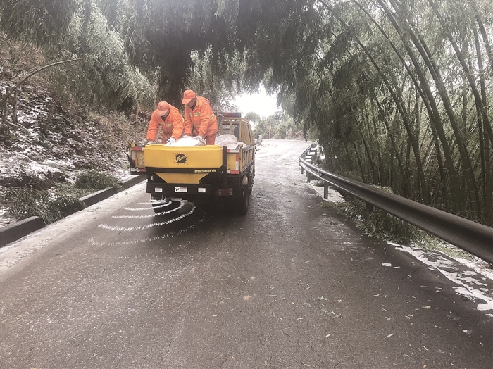图为路政人员在尚界线上撒布融雪剂。