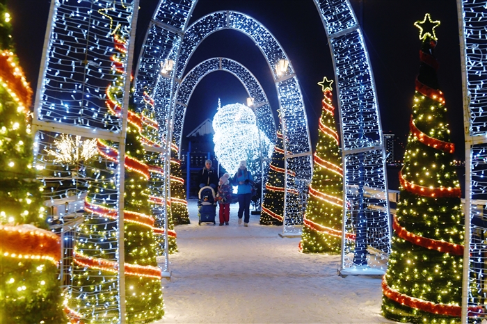 12月8日,在俄罗斯喀山,人们从童话小镇的彩灯隧道里走过。