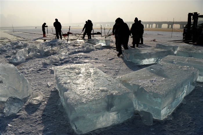 随着哈尔滨进入冰雪旅游季节,有关部门组织工人们在封冻的松花江上采冰,用于哈尔滨市区各个冰雪景观的制作。