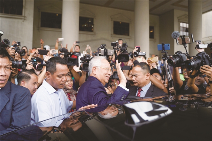 12月12日,在马来西亚吉隆坡,马来西亚前总理纳吉布(中)离开法院时向人们挥手。