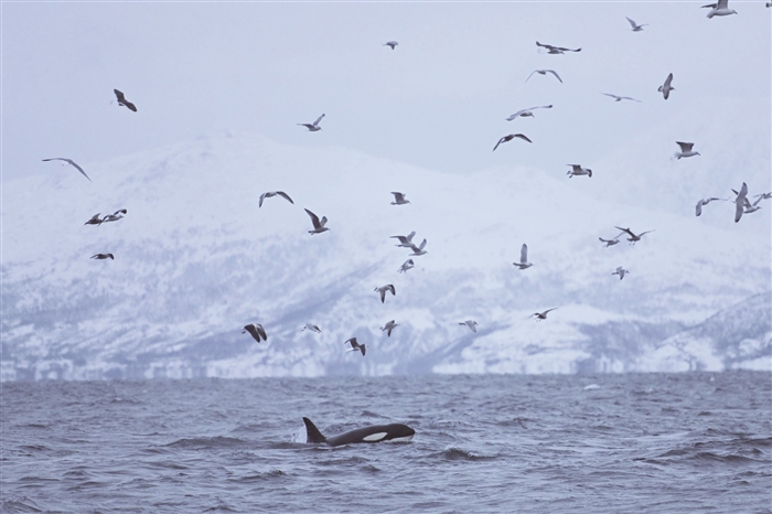 1月14日,在挪威北极圈内的北极地区城市特罗姆瑟附近,一头逆戟鲸在海中捕食。新华社发