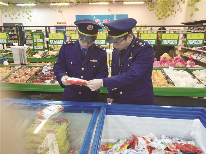 元宵佳节即将来临,区市场监管局连续多日对辖区超市的元宵节食品进行安全专项检查。图为执法人员在一超市检查。通讯员 马俊杰
