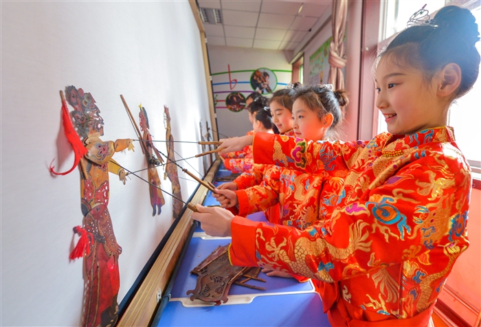 2月15日,邯郸市邯山区滏河学校的学生在表演皮影戏。